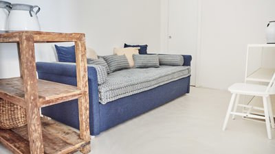 The sleeping area can accommodate up to five guests and includes a bedroom with a double bed, a double sofa bed, and a single sofa bed in the living area, making it a flexible option for couples, friends, or small families.
