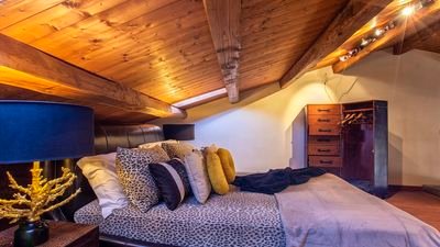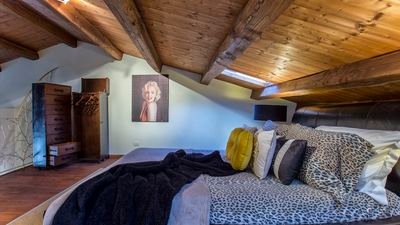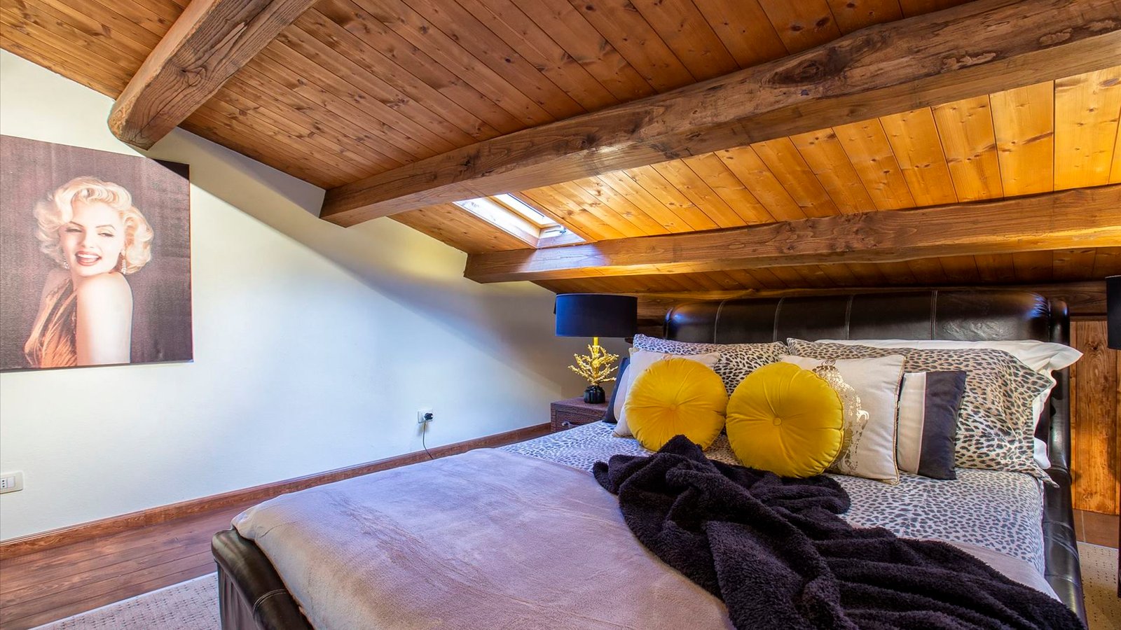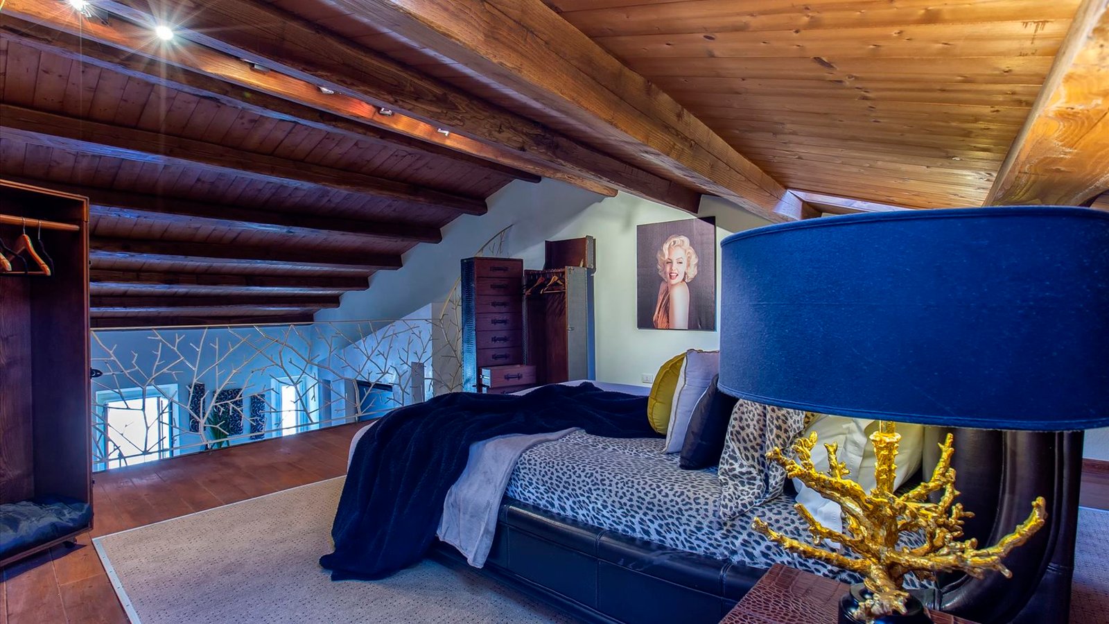 The sleeping area includes a double bed located in the attic, reachable through a staircase located in the living room.
