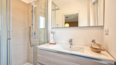 It has a second bathroom, a fully equipped kitchen and a dining room with sofa which leads to a partly covered terrace where you can dine and partly a solarium with a relaxation area with sofa and armchairs.