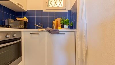 The kitchen is equipped with dishes, tableware and major appliances: oven, dishwasher and fridge/freezer.