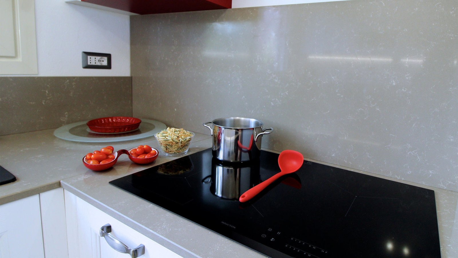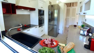 The kitchen is fully stocked with everything you need for home-cooked meals, including an oven, dishwasher, fridge/freezer, dishes, and tableware.
