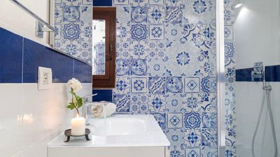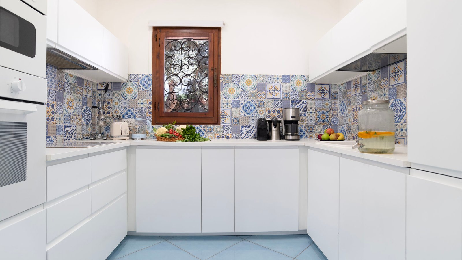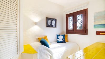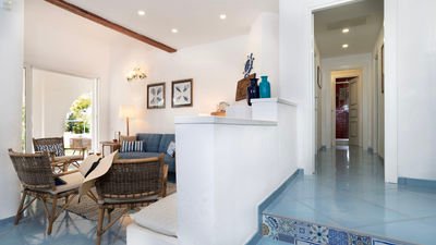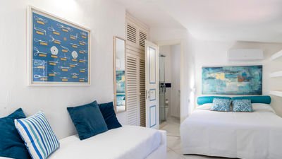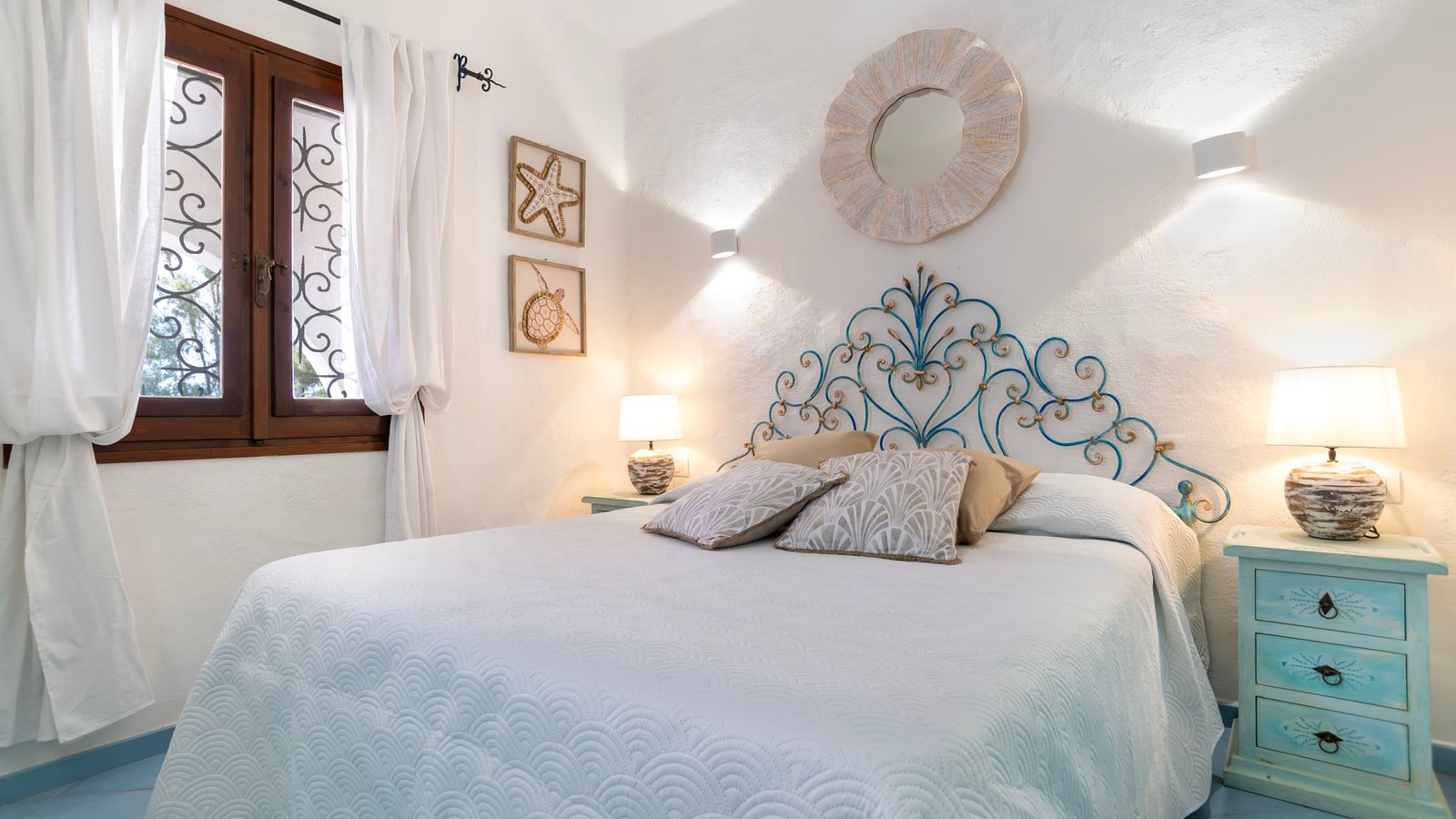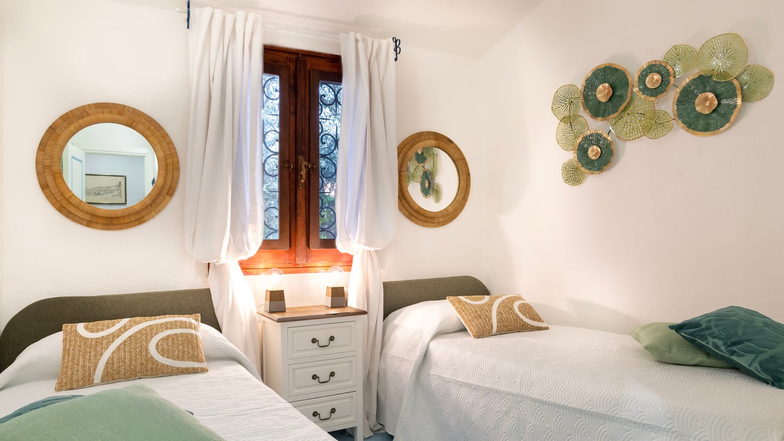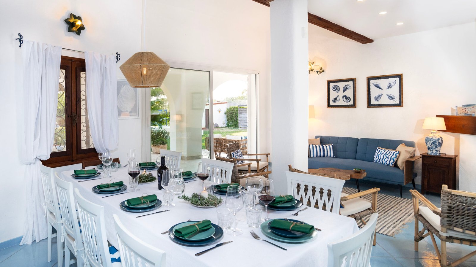 The villa is fully air-conditioned, with interiors featuring light blue flooring, a spacious and sunlit living area, and intimate bedrooms adorned with vibrant wall colors and private bathrooms—creating a cozy, stylish haven for a memorable holiday. The lush, fenced garden borders directly onto the beach and is framed by majestic palm trees and Mediterranean vegetation, including fragrant shrubs and colorful blooms.