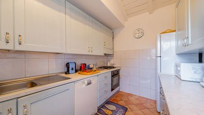 The kitchen is equipped with dishes, tableware and major appliances: oven, microwave and dishwasher.