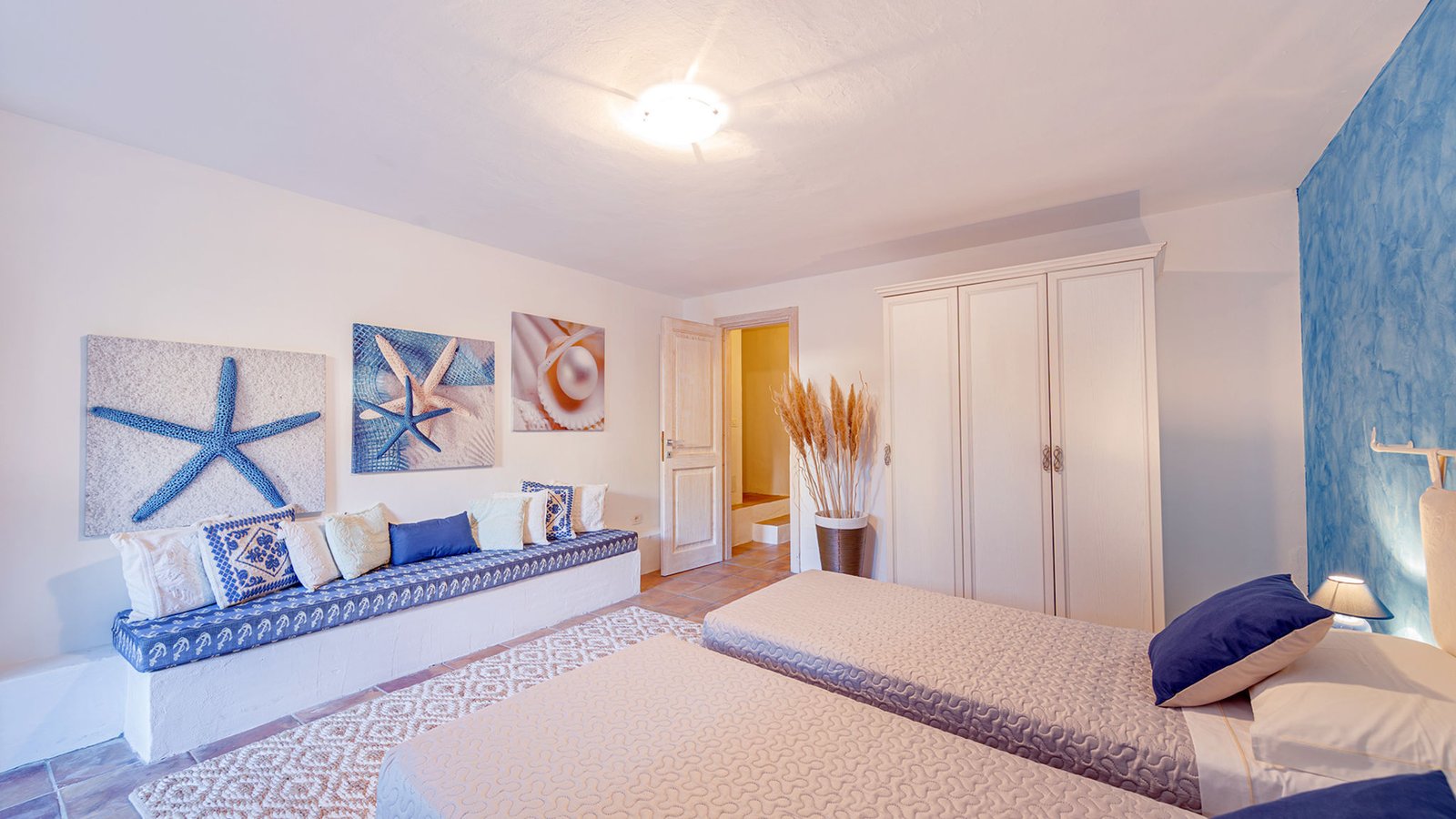 The sleeping area consists of 5 bedrooms with 5 double beds, can accommodate up to 10 people.