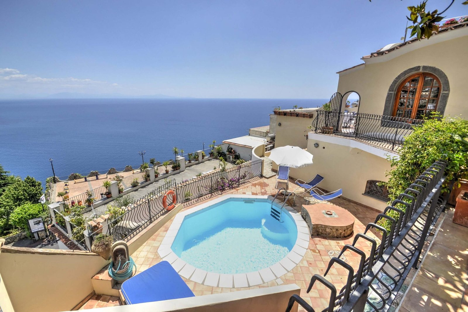 This villa is a few steps away from the main square, and it also features a private garage at the end of the pedestrian area. In order to arrive at the villa from the garage area, all you have to do is ascend a short 38-step staircase. The main square is a large terrace overlooking the coastal scenery.