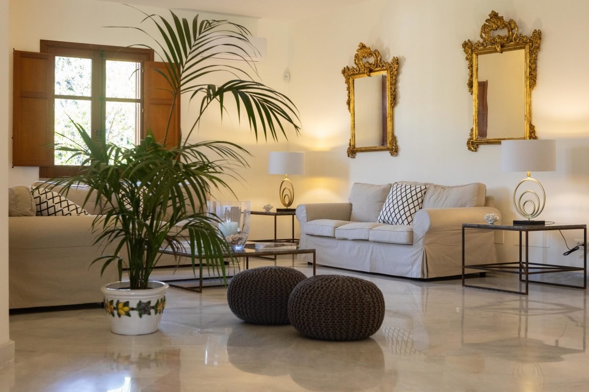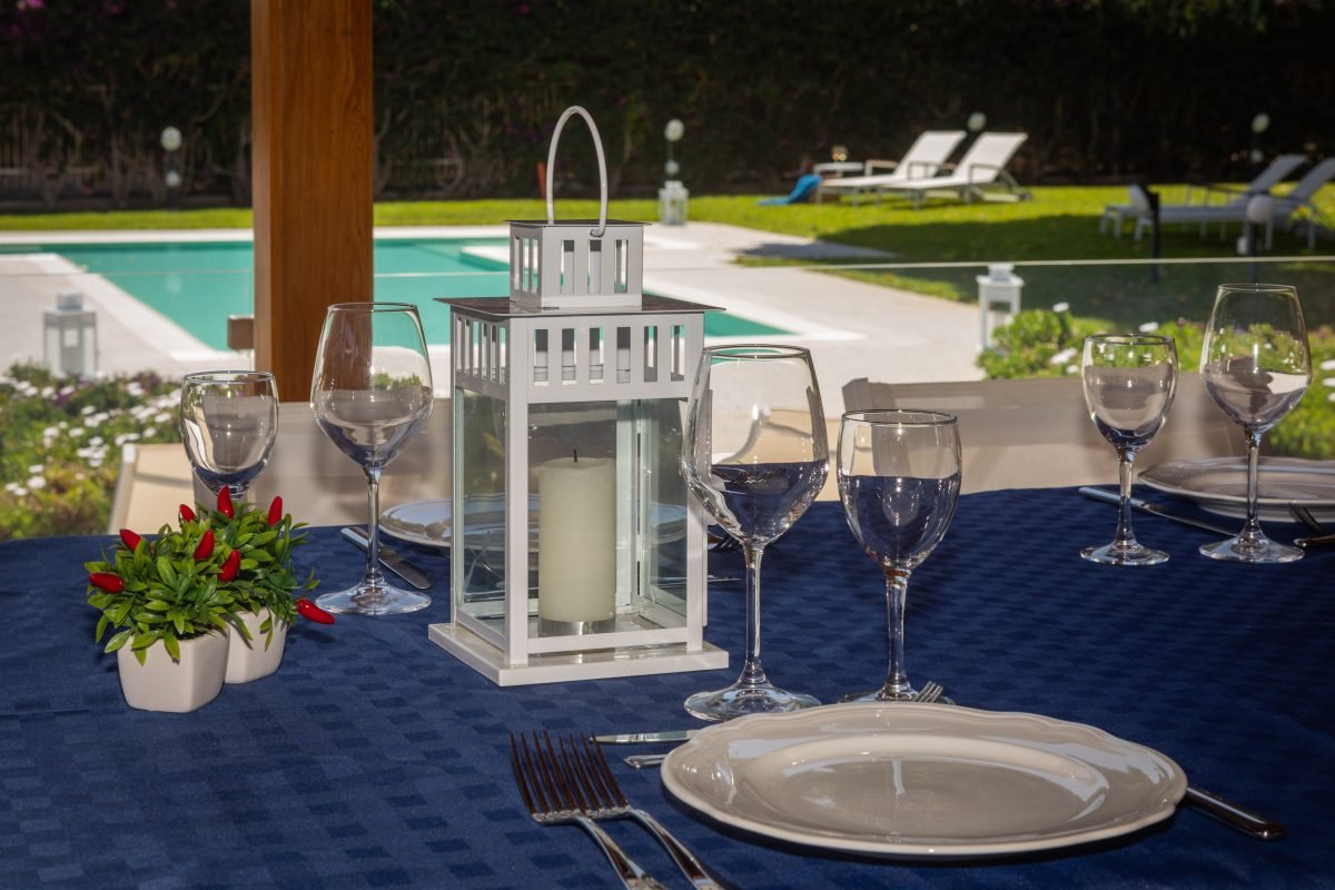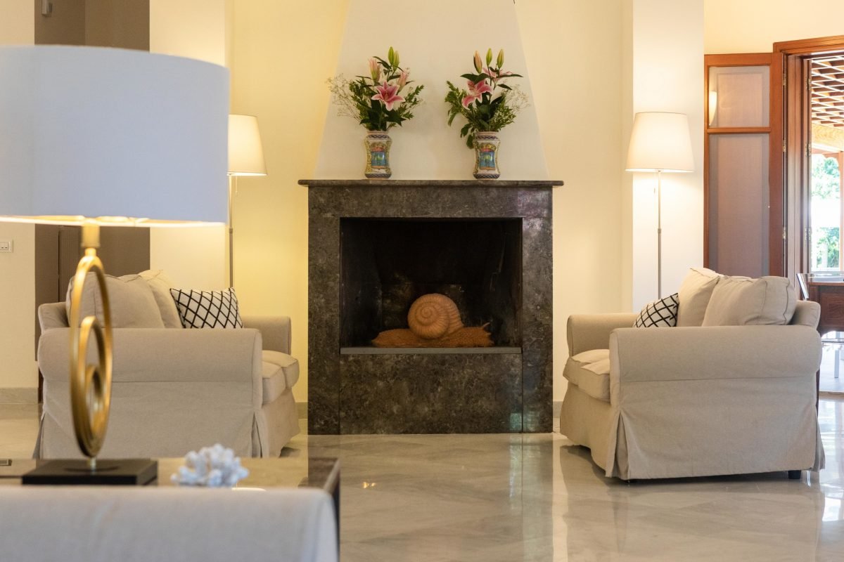 The villa is on 3 levels connected by flights of stairs: on the garden level is a very large living area with fireplace, TV room, dining room, large kitchen, office and guest bathroom. The living room overlooks a large sheltered portico — creating a perfect outdoor dining area, sheltered from the heat of the mid-day sun.