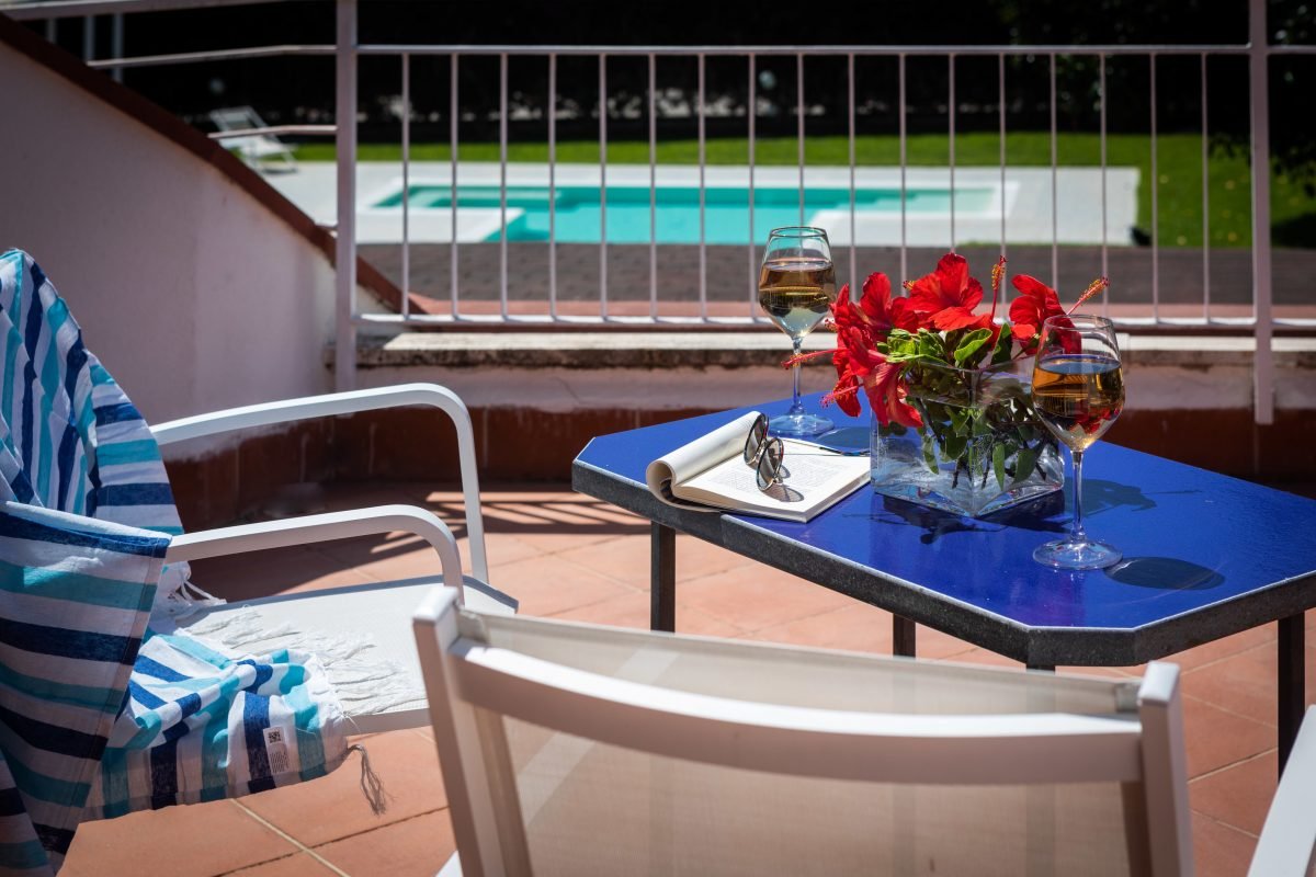 On the first floor there are two spacious suites with ensuite bathrooms, walk-in closets and a private terrace overlooking the pool.